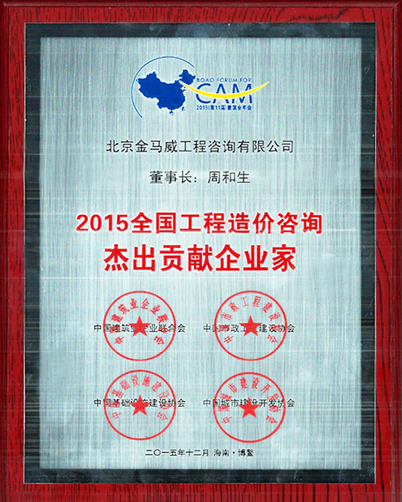 2015年12月25日,由中國建筑業企業聯合會發起,聯合中國基礎設施建設協會、中國市政工程建設協會等單位聯合主辦的“博鰲論壇·2015(筑業年會”在海南博鰲順利召開, 年會現場同時發布了2015年度優秀企業和優秀人物等以及2015中國建筑業優秀企業和人物的頒獎榜單,金馬威榮獲“2015全國造價咨詢AAAAA級信用示范單位”,周和生董事長榮獲“2015全國工程造價咨詢杰出貢獻企業家”榮譽稱號。